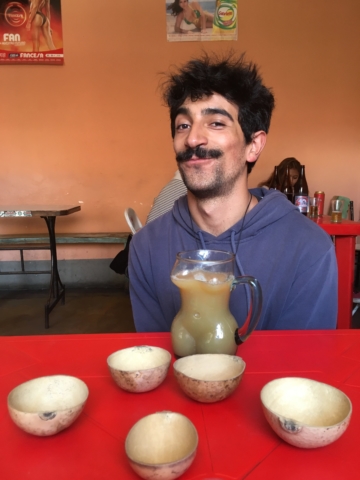 - Condor Trekkers Walking Tour – Nils and Laura also mentioned the Condor Trekkers walking tour and we’re glad we followed their recommendation. The walking tour costs 50 Bs ($7.24) per person but it’s great. You learn about some of the local indigenous cultures, and Bolivia’s history and politics. Our tour only had three people: us and a woman named Sophia from London. We visited the market and tried samples of the exotic fruits and the local chorizo. This is where we bought a shockingly expensive, but delicious chirimoya for 25 Bs ($3.62). We also marveled at the meat counters which just have meat laying out all day (and possibly all night). Evidence for this fact were two cow faces that we saw in the same place in the market two days in a row. We’re still not sure how people can eat meat this way and intentionally sought out the few refrigerated sections for our food. Afterwards we went to a local chicheria to try chicha which is an alcoholic beverage typically made from corn. Historically, the indigenous people made chicha by chewing corn and spitting it into a bucket. The saliva helped the fermentation process. Luckily there is now a commercially-produced version that does not involve saliva, but Jess still didn’t think it was very good. The tour also took us to the tunnels that go under the city. The tunnels go between all of the many churches in Sucre. We climbed into one and went a few feet inside, but we couldn’t imagine making it all the way to a church underground. The tour ended at the Mirador de la Recoleta which has a beautiful view of the city. We enjoyed a beer there with Sophia and then headed down to San Felipe de Nery.