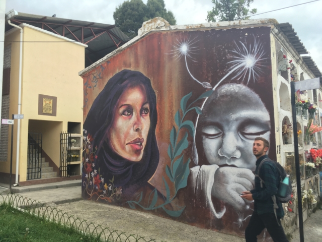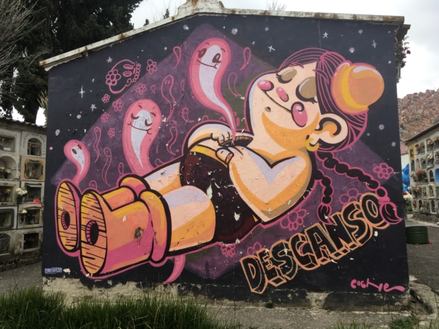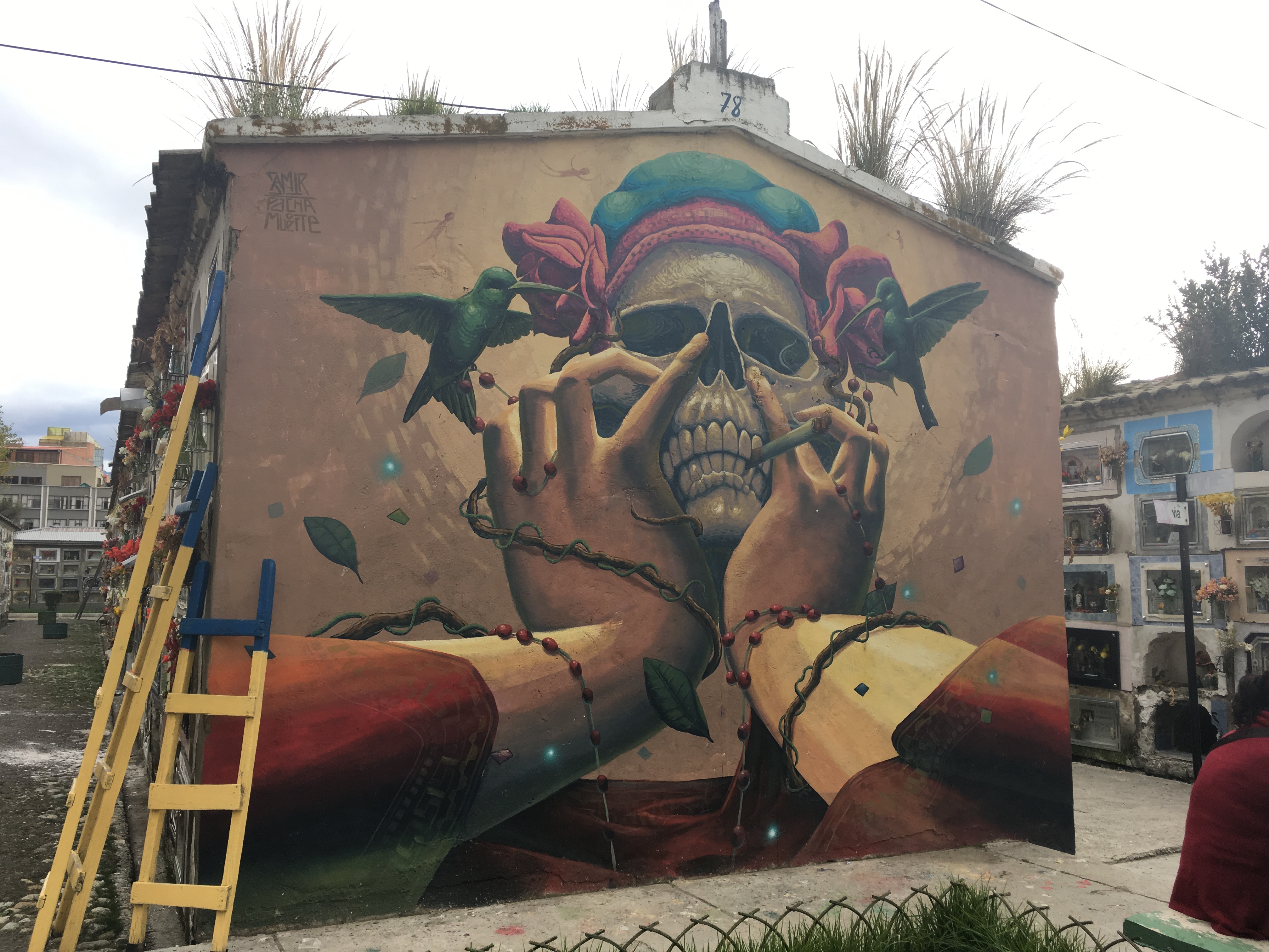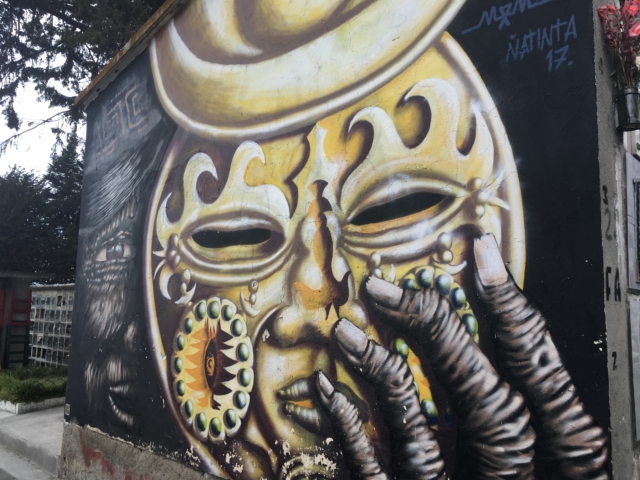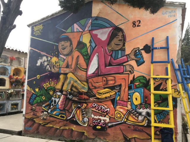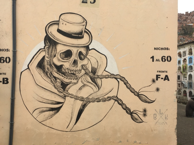 Cemetery: The Cemetery in La Paz showcases the largest open-air art gallery in the world. To the right of the entrance, the walls between the rows of graves are painted with beautiful works of art that all represent death in some way. The cemetery is free to enter and is open for most of the day. In the cemetery, we learned about the Bolivian tradition of ñatitas (literally: little noses) in which people care for a skull of a stranger, giving it cigarettes, candles, food, and flowers in exchange for protection and prosperity. If one night you dream of something bad happening to someone else, you have to give your ñatita to that person to protect them from the bad thing. The eyes of the ñatita need to be covered so the spirits don’t come in, and if it’s cold, it’s a good idea to give your ñatita a hat. Obviously, obtaining a ñatita is not that easy since it’s illegal to sell human remains. However, in the La Paz cemetery people rent space for the remains of their loved ones and if people don’t pay the rent, their loved one’s grave is emptied and rented out to someone else. Therefore to obtain a ñatita you only need to know an unscrupulous cemetery worker who will reserve the skull for you on cleanup day.