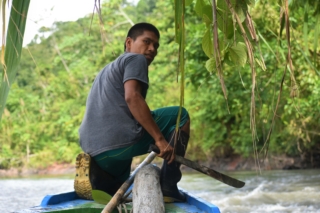 Everything was going smoothly until the propeller blade hit a rock in shallow waters and disappeared. The Madre de Dios river is a powerful river with a strong current and we were now sitting in a flat bottomed boat with no engine. Luckily we had been traveling close to an island so we could dock there while we thought about our plan. There was no spare propeller in the boat, so we needed someone to bring us one, and we needed to get to the other side of the river in order to get it. Manuel got out of the boat, got in the water up to his waist and pulled the boat upstream near the island until we were far enough up that we could launch the boat into the middle of the river and hope the current would carry us to the other side. In the meantime, the bamboo pole Arturo had been using to pole the boat broke, so he had to go in search of a new one. After an exciting ride, we made it to the other side of the river, obtained a new propeller, installed it, and we were off again on our way to camp.