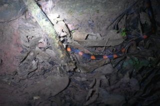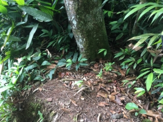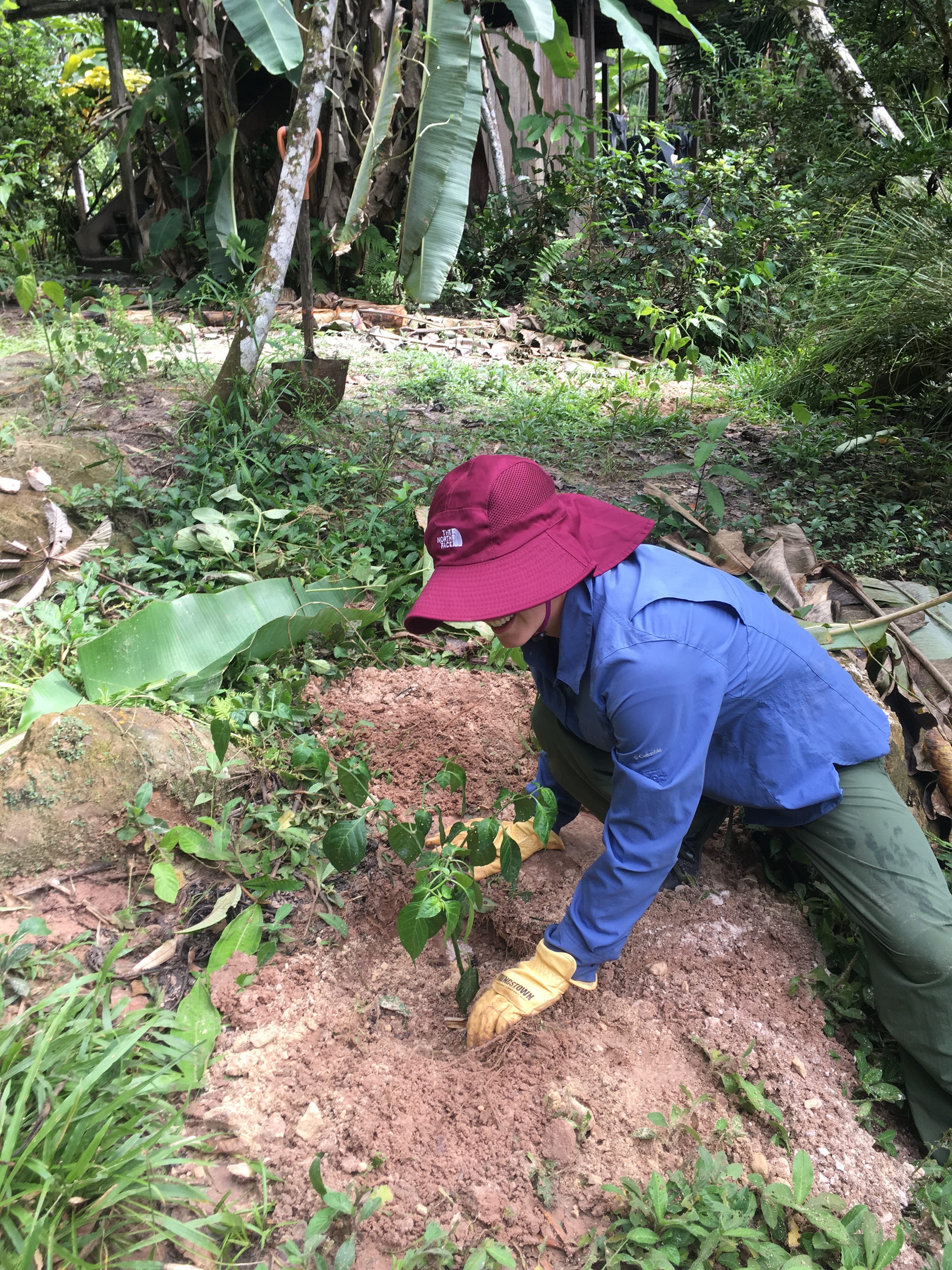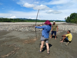 Day three was cloudy, so Arturo decided we should save our big hike up the mountain for the next day and plant trees instead. Manuel and Arturo showed us where to plant them and we dug big holes and planted a total of 10 pepper plants of varying types. Then we went out in the boat to collect yuca from Oscar’s (Manuel’s dad) house, gather more firewood, and practice shooting Oscar’s bow and arrows on the beach. Eric and Arturo swam in the river. In the evening we went out for another night hike where we saw marsupials and frogs and our first snake!