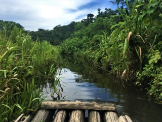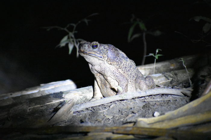 We finally made it to Salvación around 8pm where we were met by Arturo, our guide, and brought to Oliver and Carolina’s house. They have a beautiful house with a wooden platform on the second floor with tents set up. The tents are luxurious by our standards. For one, there’s actually a tent; and for two, there are mattresses inside! We were fed a delicious dinner, and then Arturo took us out on a night-time excursion around the Machu Wasi Lake. We walked through the rainforest for two to three hours shining flashlights into the trees looking for eyes. We didn’t see very much beyond a few insects, but we did see this awesome Cane toad, which was almost as big as our heads.