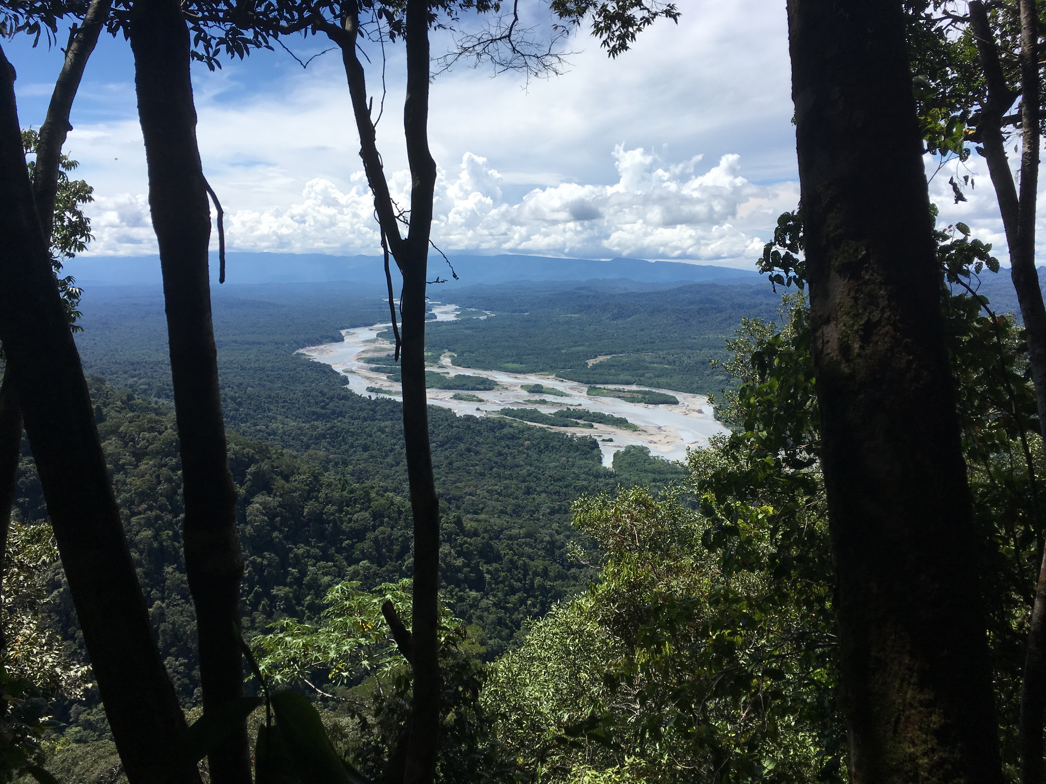 On day four, we went for a big hike up the mountain behind the camp. The camp is on private land, but it borders Manu National Park at the top of the mountain. The views from the mountain are beautiful, and the big highlight of the hike was seeing two species of monkeys: cappuchens and woolly monkeys. We hiked to the top of the mountain where we ate lunch enjoying the view before we were chased away by flies that like the smell of sweat. We walked back down, took a nap, and then went to the river to try to catch a fish for dinner. On our way we saw a woodpecker and a troop of squirrel monkeys! We were very lucky to have seen four species of monkeys during our stay. As soon as we got to the river we discovered the worms we had intended to use as bait were no longer good, so we went looking for something we could use as bait instead. Arturo found a grub, which he used to catch a fish and then he tried to use a piece of the fish as bait, but it didn’t really work. (Apparently this is something that can work, but it didn’t seem to us that fish would like to eat fish.) Eventually we went back to camp to find more worms and then returned to the river to fish. The moon was full and Arturo told us the indigenous people know not to fish on full-moon nights because the moon is fishing and they won’t catch anything. We think they’re on to something as we didn’t catch any fish either.