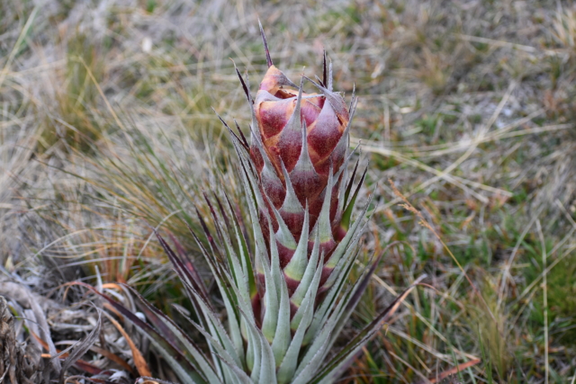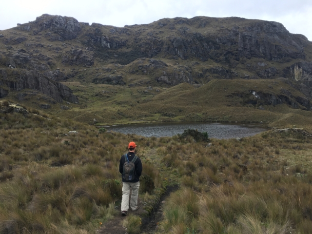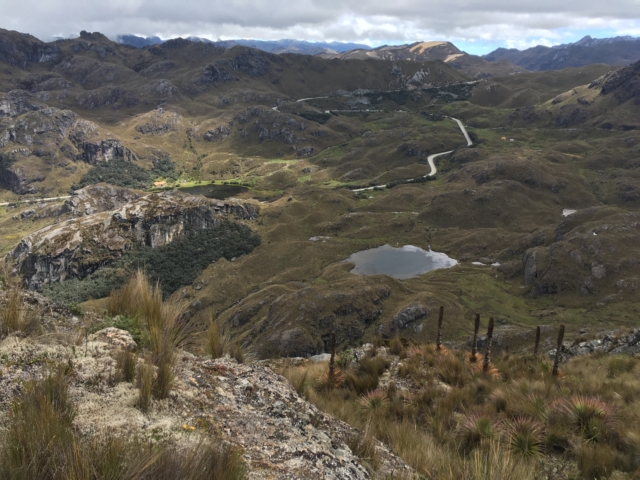 On our second day we ventured out to Cajas National Park. We caught a bus from the Terminal Terrestre towards Guayaquil for $2 plus the $0.10 terminal fee per person and asked to be dropped off at Cajas. Forty five minutes later we arrived at the visitor center and registered for Ruta 2, a 7km hike that ranges in altitude from 3,928 meters (12,883 feet) to 4,267 meters (13,996 feet). The first kilometer and a half of this hike is along the busy road that runs through Cajas, but eventually we found a trail marker on the right and we were off the road. The trail crosses a sort of mossy swamp before climbing up Cerro San Luis and coming back down the other side. At this elevation there are no trees so there is almost no wind block and it happened to be a pretty rainy day to begin with. From the top of the hill you can see as many as 17 lakes and the view is quite pretty. Seven kilometers was far shorter than our long hike a few days earlier but it was still an ambitious task given the altitude – our highest hike ever!
