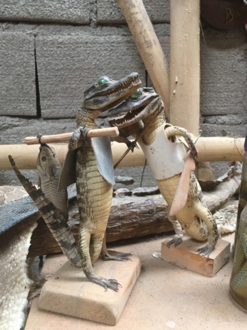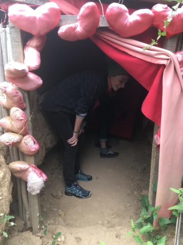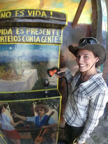 The first day we were at the winery, there were quite a few large tour groups. Jesús asked us to join one of the tours, so we could get the lay of the land. The tour started with Jesús asking people in the tour group to read aloud from some of the funny posters hanging around the winery. After that, it continued into the museum which has a rather eclectic collection of old objects including typewriters, calculators and computers as well as fossils, bones, animal skins and other unusual objects. After the museum, we walked around to the other side of the grape fields where Jesús showed us the Tunnel of Love. The Tunnel of Love is a 50-foot long tunnel decorated with red and pink hearts at the entrance and exit. Inside it is pitch black and legend has it that the darkness allows you to open yourself to true love. After walking through the Tunnel of Love, the tour continues up past the old swimming pool, which is in a state of disrepair, to the bodega where the finished wine is stored. Outside the bodega, there is a wooden structure shaped like a gas pump with a garden hose attached. Jesús stopped near the hose, picked it up, and filled a glass with wine! It turns out the garden hose is the surtidor (pump) and lots of people like to buy wine directly from the surtidor in big jugs. Who doesn’t want their wine served out of a garden hose? It was at this point that we realized why we had been filling containers at the top of a scaffolding with wine – they were feeding the surtidor! After trying the wine from the surtidor, we went to the wine tasting area.