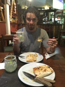 It was 8pm and we were the only people in the restaurant. That’s not usually a great sign, but the waiter was very attentive, and we were very hungry. He recommended calzones, which they make with cassava, so we ordered two and two caipirinhas.