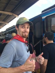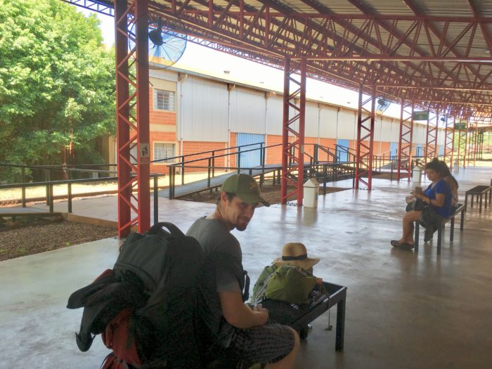 We almost certainly could have taken a bus to the train station, but despite four days in Encarnación, we haven’t figured out the city buses at all. The city is pretty walkable, so we haven’t found it necessary. And by the time we were ready to go to the train, it was a bit late to try to figure it out, so we suited up with all our gear and began the hot walk in 100 degree temperatures. It took about 90 minutes to get there with one small break. Thank goodness for the Camelbak water bladders we received as a wedding gift. We use them practically every day and definitely needed them on this trek.