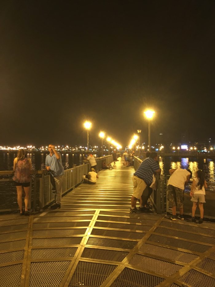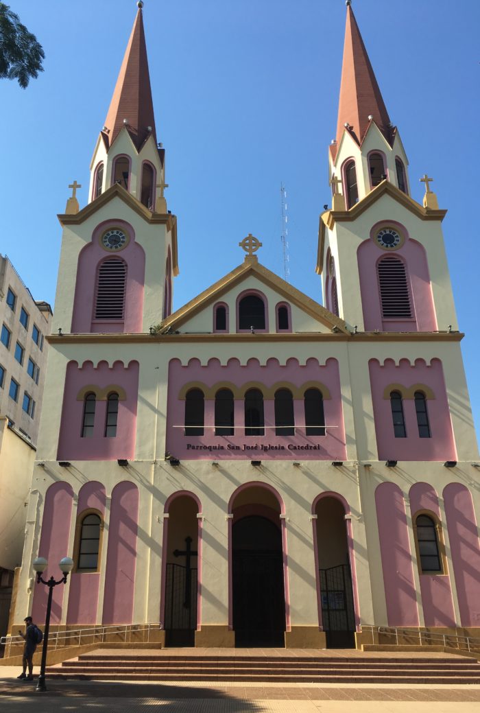 We found our Airbnb and dropped our bags and promptly set off again to explore the city. Posadas is roughly two times the size of Encarnación, but there still doesn’t seem to be much to see or do there. We tried to visit the Museum of Fine Arts, but it was closed. We saw the pink cathedral and a fun statue of a guy drinking maté. We decided to find a park to drink our own maté and finish our third cribbage season. Unfortunately, the Plaza 9 de Julio had a lot of homeless people living in it and didn’t seem to be the nicest place to hang out, so we went to the Plaza San Martin instead. After Jess’s spectacular cribbage victory, we went in search of the Costanera and some ice cream. The Costanera in Posadas is fantastic. It is very well lit and is bustling well into the evening. People set up lawn chairs and small tables and drink mate, eat dinner, hang out with friends while the sun goes down. There are joggers, cyclists, people out for a stroll. There’s a boardwalk out over the river that is lit up at night and has a fantastic view of Encarnación. After strolling down the boardwalk for a while, we went in search of dinner and found a restaurant called Marandú.